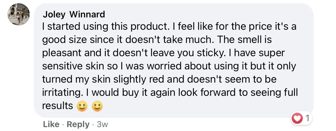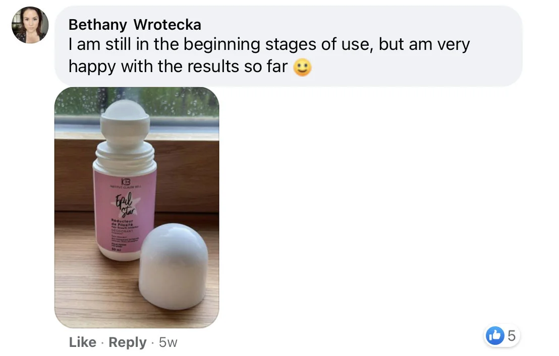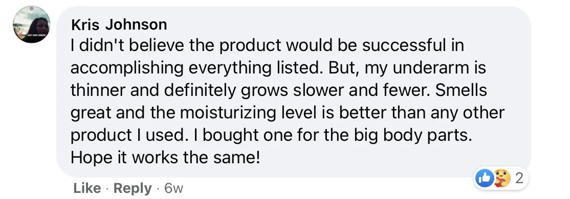I didn't believe the product will be successful to accomplished everything listed. But, my underarm is thinner and definitely grows slower and fewer. Smells great and the moisturizing level is better than any other product I used. I bought one for the big body parts. Hope it works the same!